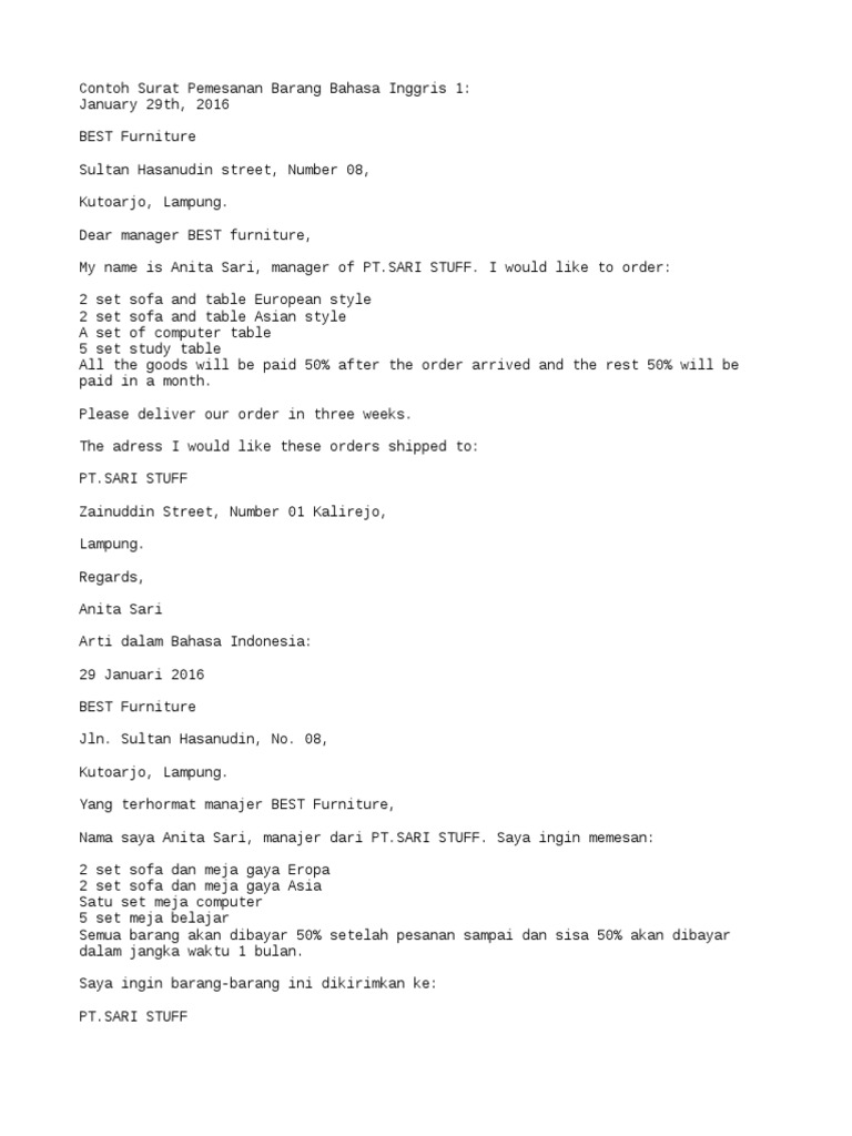 Contoh Surat Pemesanan Barang Elektronik Dalam Bahasa Inggris Dan Artinya / 7 Contoh Surat Pemesanan Barang Terlengkap / Bagi kalian yang memiliki bisnis atau menjadi admin di perusahaan, haruslah mengetahui bagaimana cara membuat surat yang baik dan benar.. Contoh surat pesanan bahasa inggris. Materi lainnya 3 contoh surat cinta dalam bahasa inggris dan artinya. Atau dalam hal pembuatan tugas sekolah yang mengharuskan kalian harus bisa membuat surat pribadi menggunakan bahasa inggris dan biasanya juga dalam soal ujian nasional sering keluar materi surat ini maka kalian harus. Berikut ini adalah contoh surat pesanan dalam bahasa inggris, semoga bermanfaat yah untuk sahabat kbi! Ahmad yani street, number 15, palembang.